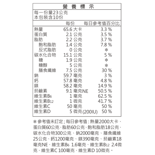 難消化性麥芽糊精、木醣醇、可可粉(含碳酸鉀)、全脂奶粉、綜合乳酸果蔬發酵濃縮粉(LaLaBling複方乳酸菌果蔬發酵濃縮物(水、糖、糖蜜、鳳梨、青木瓜、火龍果、芭樂、酪梨、梨子、甜菜根、山藥、蘋果、葡萄、番茄、奇異果、哈密瓜、檸檬、橘子、柳橙、金桔、葡萄柚、香蕉、紅石榴、百香果、諾麗果、草莓、紅棗、櫻桃、藍莓、桑葚、楊桃、蓮霧、西瓜、甜瓜、龍眼、荔枝、桃子、李子、梅子、蜜棗、柿子、枇杷、杏仁、紅甘蔗、青花菜、芥藍、美國芹菜、秋葵、苜蓿芽、甜椒、紅鳳菜、絲瓜、山苦瓜、黑豆、紅豆、綠豆、豌豆、南瓜、胡蘿蔔、薑、牛蒡、地瓜、芋、蓮藕、黑木耳、香菇、金針菇、猴頭菇、舞茸、乳酸菌(熱滅死菌))、竹筍纖維、阿拉伯膠、木糖醇(甜味劑)、二氧化矽、青木瓜萃取物(麥芽糊精、青木瓜萃取物)、鳳梨萃取物(鳳梨萃取物、麥芽糊精))、玉米糖膠、麩胺酸發酵物(含麥芽糊精、GABA)、色胺酸、洋甘菊萃取物(含麥芽糊精)、紅藻粉(含海藻鈣)、鹽、氧化鎂、維生素C、羅布麻萃取物、菸鹼酸、VitaminD3V®素食維生素D3粉(麥芽糊精、阿拉伯膠、中鏈三酸甘油酯、維生素C(抗氧化劑)、膽鈣化醇(維生素D3)、維生素E(抗氧化劑))、維生素B6、維生素B12(麥芽糊精、檸檬酸鈉、檸檬酸、維生素B12)。