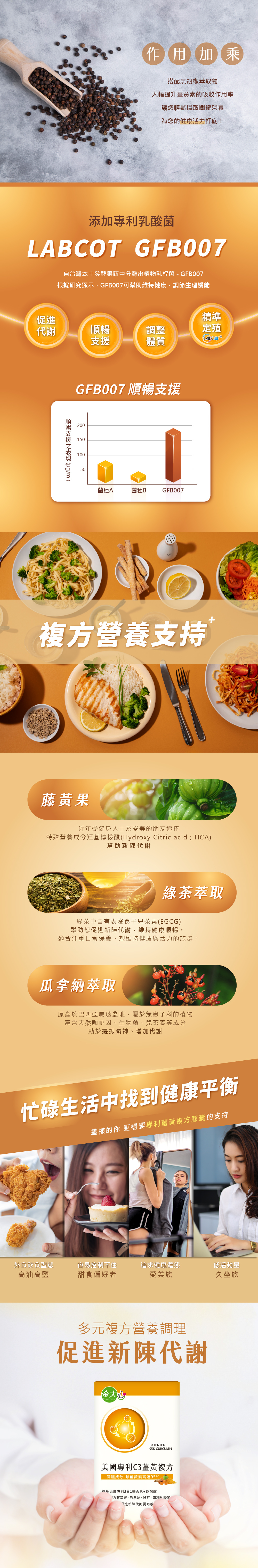 薑黃萃取物、藤黃果提取物粉末(藤黃果萃取物、麥芽糊精)、乳酸菌粉Lactobacillus plantarum(L. plantarum凍乾粉、麥芽糊精)、綠茶萃取物、瓜拿納萃取物(瓜拿納萃取物、麥芽糊精、綠咖啡豆萃取)、胡椒鹼。