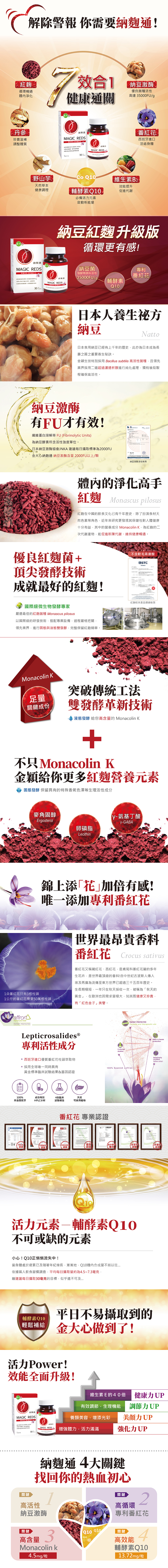 紅麴粉末、丹參萃取物、納豆發酵粉末(納豆菌發酵物(含納豆激酶) 、麥芽糊精、微結晶狀α-纖維素)、野山芋提取物、輔酵素Q10、affron®番紅花萃取物、維生素B2。