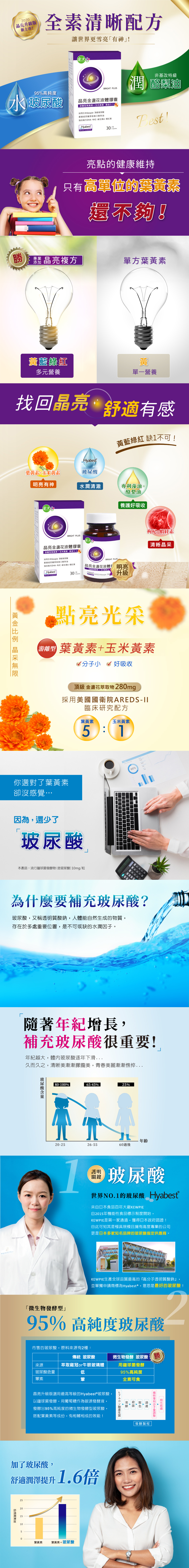 金盞草萃取物(含葉黃素、玉米黃素、葵花油)、酪梨油、 life's® Omega60專利藻油(含DHA、EPA、葵花油、迷迭香抽出物、生育醇(抗氧化劑)、L-抗壞血酸棕櫚酸酯(抗氧化劑))、枸杞萃取物(含麥芽糊精)、維生素E、流行鏈球菌發酵物(含透明質酸鈉)、紅藻提取物(含蝦紅素、維生素E(抗氧化劑)、中鏈三酸甘油酯)、乾燥維生素A醋酸鹽325 CWS/A 型(維生素A粉末、維生素E(抗氧化劑)、玉米澱粉、阿拉伯膠、乾燥葡萄糖漿)