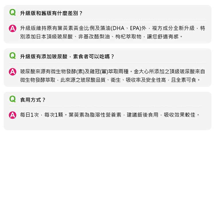 金盞花萃取物(含葉黃素、玉米黃素、葵花油)、酪梨油、life´s® OMEGA60專利藻油(DHAEPA、葵花油、迷迭香抽出物、生育醇(抗氧化劑)L-抗壞血酸棕櫚酸酯(抗氧化劑)) 、枸杞萃取物(含麥芽糊精)、維生素E、流行鏈球菌發酵物(含透明質酸鈉)、紅藻提取物(含蝦紅素、維生素E(抗氧化劑)、中鏈三酸甘油酯)、乾燥維生素A醋酸鹽 325CWS/A (乾燥葡萄糖漿、阿拉伯膠、玉米澱粉、維生素A乙酸酯、維生素E(抗氧化劑)