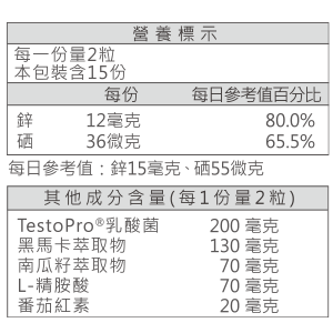 TestoPro®乳酸菌粉 (芽孢乳桿菌)、亞麻仁萃取物、番茄紅素Lycotene 10% WSC(辛烯基丁二酸鈉澱粉、麥芽糊精、葵花油、番茄紅素、蔗糖、L-抗壞血酸(抗氧化劑)、L-抗壞血酸鈉(抗氧化劑)、二氧化矽、維生素E(抗氧化劑))、黑馬卡萃取物、葡萄糖酸鋅、南瓜子萃取物(含麥芽糊精)、L-精胺酸、硒酵母、硬脂酸鎂、二氧化矽。