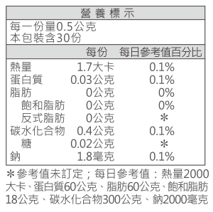 膠囊成分:羥丙基甲基纖維素、果膠、純水、甘油、二氧化鈦、結蘭膠、檸檬酸甘油酯(含抗氧化劑:維生素E、維生素C)、硫酸月桂酯鈉、氯化鉀。