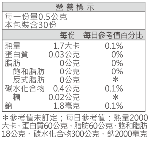 膠囊成分:羥丙基甲基纖維素、果膠、純水、甘油、二氧化鈦、結蘭膠、檸檬酸甘油酯(含抗氧化劑:維生素E、維生素C)、硫酸月桂酯鈉、氯化鉀。