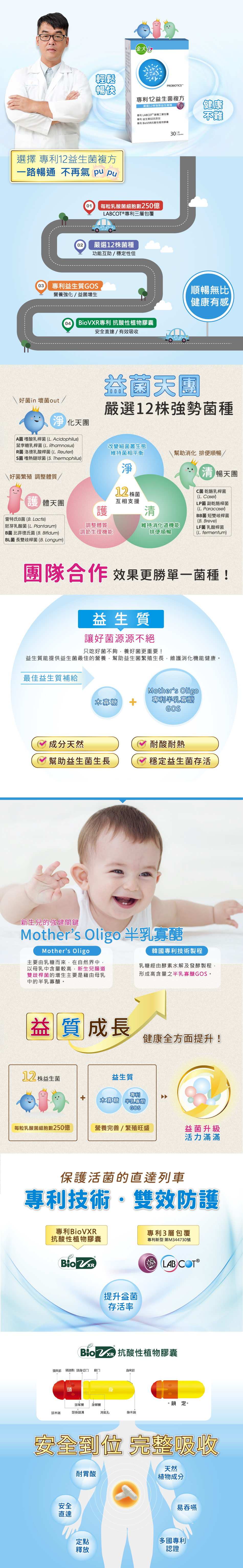 12株乳酸菌(微結晶狀α-纖維素、乳酸菌凍乾粉(麥芽糊精、乾酪乳桿菌L. casei, 植物乳桿菌L.plantarum, 鼠李糖乳桿菌L. rhamnosus, 短雙歧桿菌B.breve , 乳雙歧桿菌B. lactis, 長雙歧桿菌B.longum, 副乾酪乳桿菌L. paracasei, 嗜熱鏈球菌S.thermophilus, 嗜酸乳桿菌L. acidophilus, 羅伊氏乳桿菌L.reuteri, 兩歧雙歧桿菌B. bifidum,發酵乳酸桿菌L.fermentum))、Mother'sOligo專利半乳寡醣GOS(半乳寡醣、乳糖)、木寡醣。