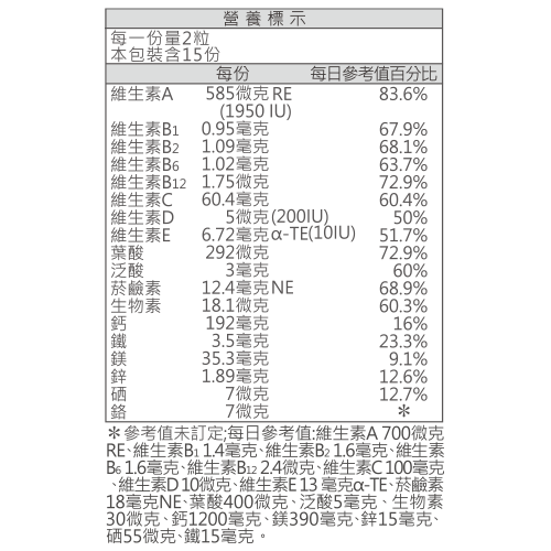 綜合礦物質(碳酸鈣、麥芽糊精、氧化鎂、葡萄糖酸鋅、焦磷酸鐵、硒酵母、鉻酵母(非活性酵母、三氯化鉻))、微結晶狀α-纖維素、維生素C、硬脂酸鎂、維生素B群(菸鹼醯胺、本多酸鈣、維生素B12 0.1% WS型(麥芽糊精、檸檬酸鈉、檸檬酸、維生素B12)、維生素B2、維生素B6、維生素B1、葉酸、生物素)、乾燥維生素E 50% CWS/S型(維生素E醋酸鹽、麥芽糊精、辛烯基丁二酸鈉澱粉、二氧化矽)、乾燥維生素A醋酸鹽325CWS/A型(乾燥葡萄糖漿、阿拉伯膠、玉米澱粉、維生素A乙酸酯、維生素 E(抗氧化劑)、玉米澱粉、阿拉伯膠、乾燥葡萄糖漿)、Vitamin D3V®素食維生素D3粉(麥芽糊精、阿拉伯膠、中鏈三酸甘油酯、維生素C (抗氧化劑)、膽鈣化醇(維生素D3)、維生素E(抗氧化劑))。