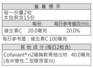 葡萄糖胺鹽酸鹽、甲基硫醯基甲烷(含二氧化矽)、鯊魚軟骨粉末、薑黃萃取物(含麥芽糊精)、Collavant®n2雞胸軟骨抽出物(含非變性二型膠原蛋白)、流行鏈球菌發酵物(含透明質酸鈉)、L-抗壞血酸(維生素C)