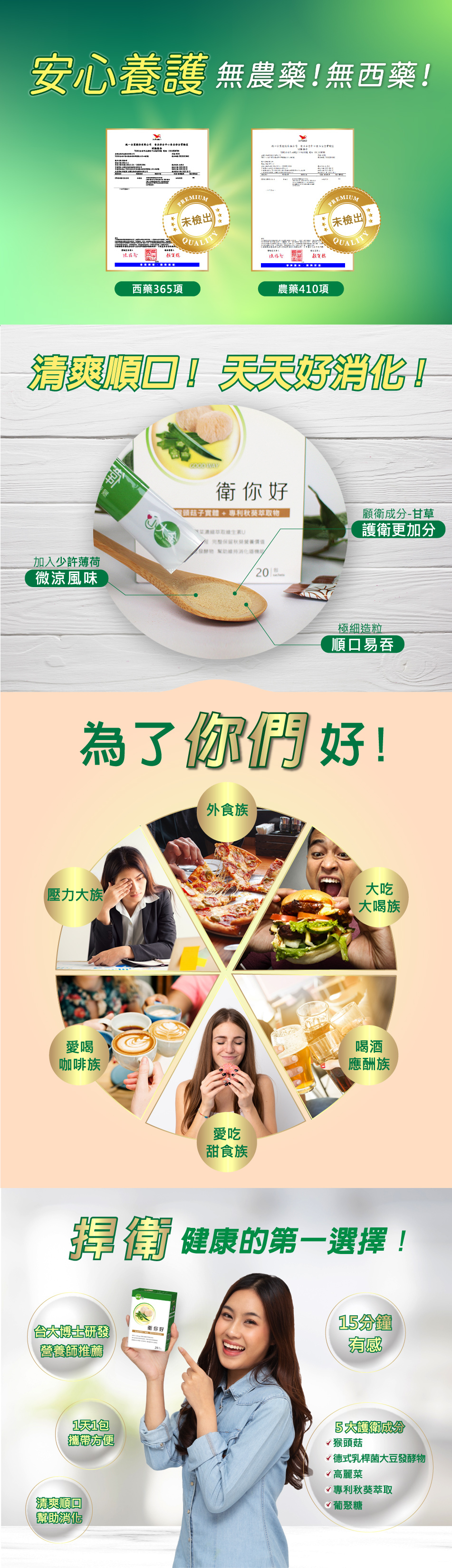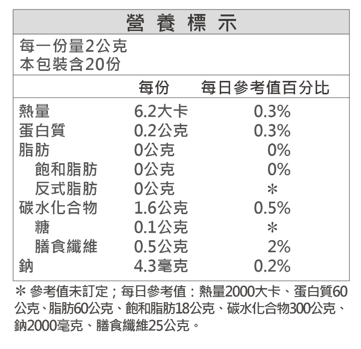 猴頭菇子實體萃取濃縮粉末(糊精纖維、猴頭菇子實體(Hericium erinaceus;太空包栽培)萃取濃縮物)、菊糖、β-聚葡萄糖(黑酵母發酵萃取液(Aureobasidiumpullulans,液態發酵)、麥芽糊精)、薄荷香料(乳糖、二氧化矽、香料)、秋葵萃取物(秋葵、麥芽糊精)、Gastro-AD 保衛樂®(大豆發酵物(由德氏乳桿菌Lactobacillus delbrueckii發酵))、甘草萃取粉(甘草、麥芽糊精)、高麗菜濃縮粉、甘草濃縮物(甘草濃縮物、玉米澱粉)。