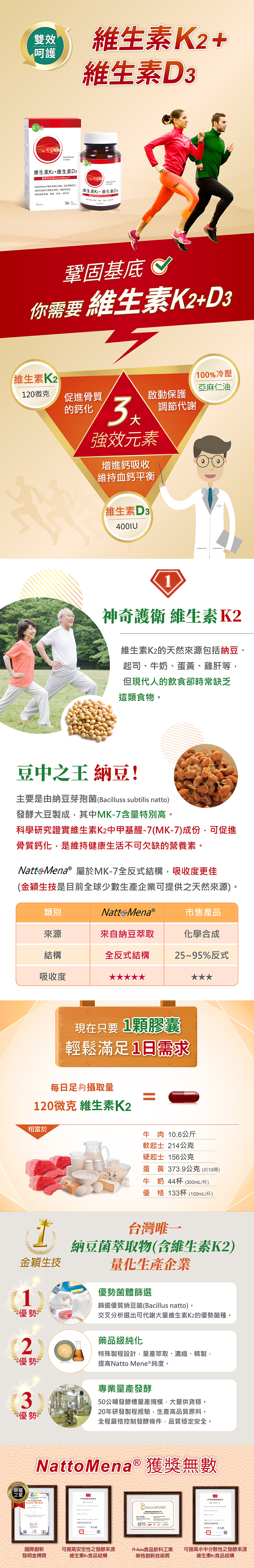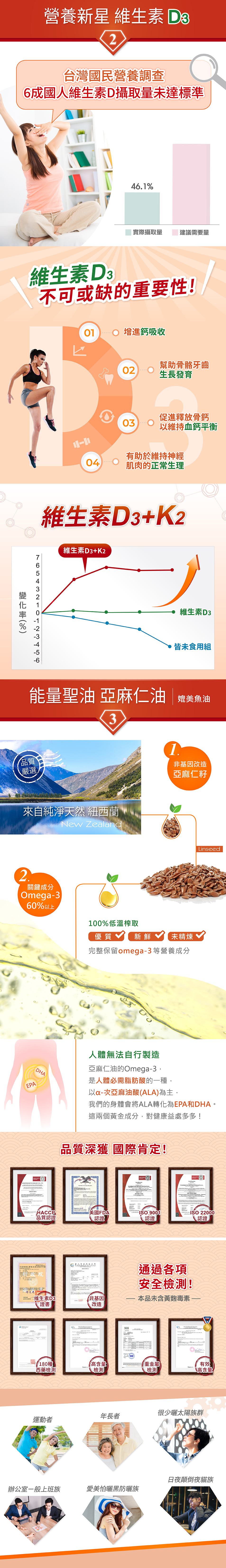 亞麻仁籽油、納豆菌萃取物NattoMena® (中鏈三酸甘油酯、納豆菌萃取物(含維生素 K2))、維生素E、Vitamin D3V®素食維生素D3粉(麥芽糊精、阿拉伯膠、中鏈三酸甘油酯、維生素C(抗氧化劑)、膽鈣化醇(維生素D3)、維生素E(抗氧化劑))