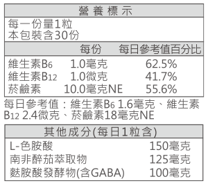 L-色胺酸、南非醉茄萃取物(南非醉茄萃取物、麥芽糊精、二氧化矽)、麩胺酸發酵物(含麥芽糊精、GABA)、玉米澱粉、菸鹼酸、芝麻萃取物(含麥芽糊精)、微結晶狀α-纖維素、蜜環菌菌絲體粉末(Armillaria mellea mycelia,液態發酵)、硬脂酸鎂、二氧化矽、維生素B12(麥芽糊精、檸檬酸鈉、檸檬酸、維生素B12)、維生素B6 。