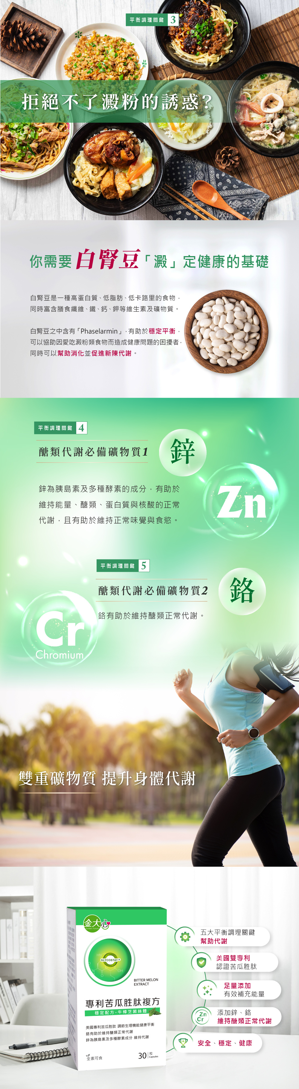 苦瓜萃取物、牛樟芝菌絲體粉末(Antrodia cinnamomea Mycelia, 液態發酵)、白腎豆萃取物粉末(白腎豆萃取物、糊精)、鉻酵母、葡萄糖酸鋅、二氧化矽、硬脂酸鎂。